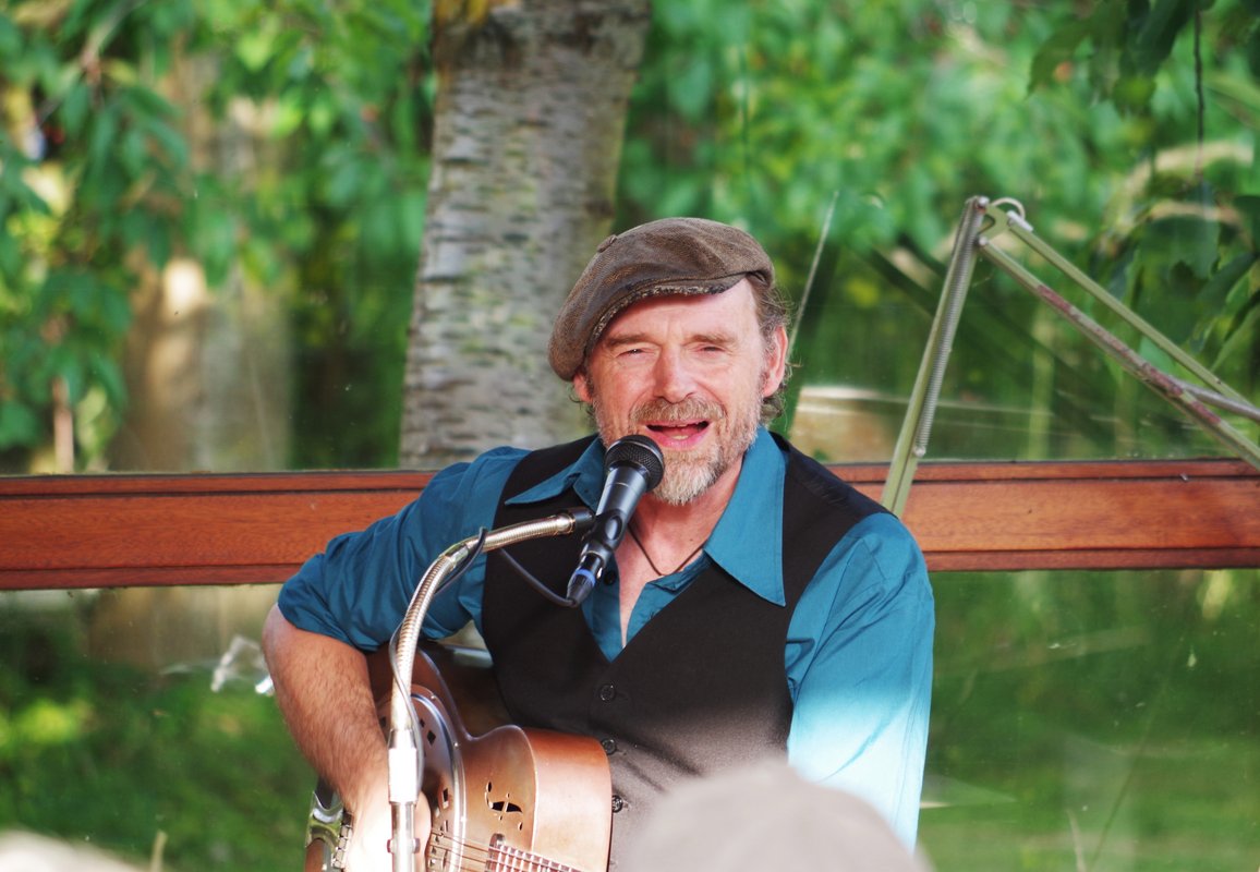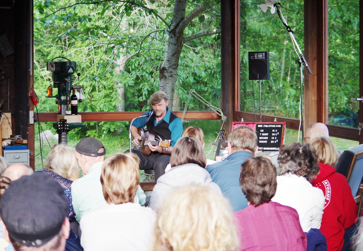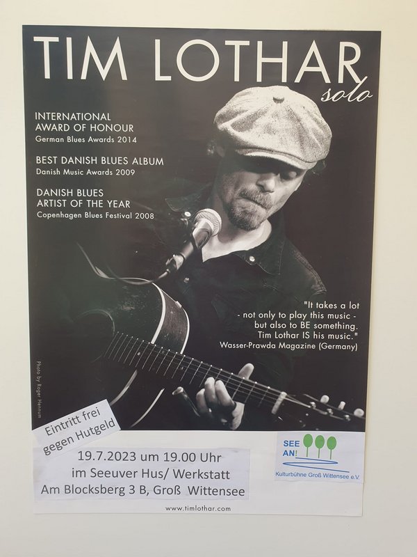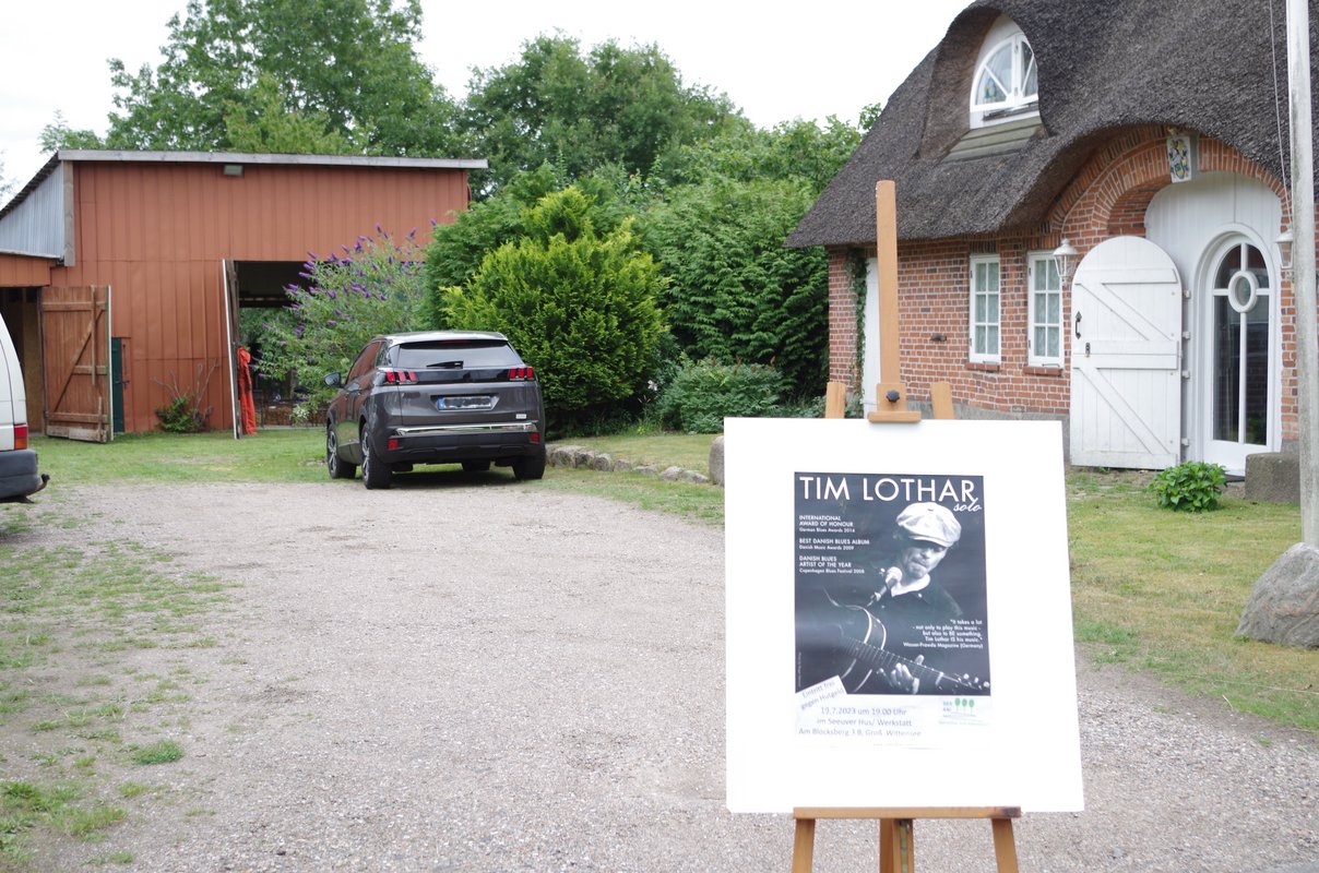 Veranstaltungsort war dieses Mal eine Künstlerwerkstatt am Blocksberg in direkter Uferlage. Strohballen auf dem Boden, einige Stühle und ein charmanter Tim Lothar, der in einer Mischung aus Deutsch und Englisch äußerst sympathisch und humorvoll vorab die Geschichten zu seinen selbstgeschriebenen Songs erzählte, dann zu seinen diversen Gitarren oder zum Banjo griff und mit charakterstarker Stimme und begnadetem Gitarrenspiel einen Blues ablieferte, als gäbe es einen direkten Draht vom Mississippi – der Wiege des Blues - über den Atlantik und den Nord-Ostsee-Kanal zum Wittensee und direkt in die Künstlerwerkstatt am Seeufer von Groß Wittensee.