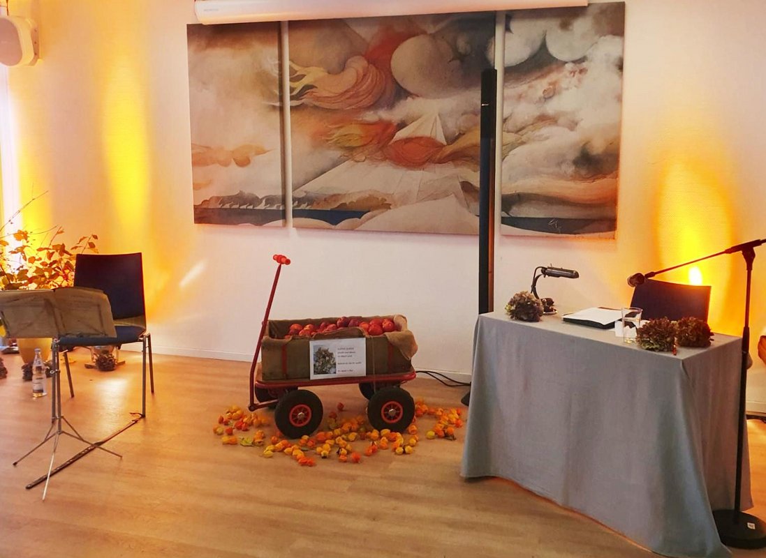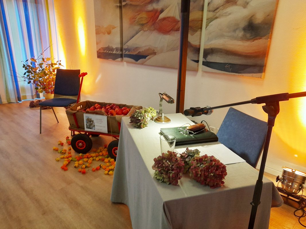 Die erste große Überraschung schon beim Eintreten: orangefarbene Scheinwerfer tauchten den sonst eher nüchternen und funktionalen Raum der „olen Kass“ in mildes Herbstlicht. Ein Bollerwagen mit frisch geernteten Äpfeln aus dem Alten Land und eine Bodenvase mit großem Herbststrauß rundeten die Kulisse für einen kurzweiligen Nachmittag ab. Manchmal sind es ja nur Kleinigkeiten, die eine Veranstaltung rund machen: so war zum Beispiel auf jedem Stuhl ein Programm mit den einzelnen Darbietungen zur Information und zum Nachlesen ausgelegt.