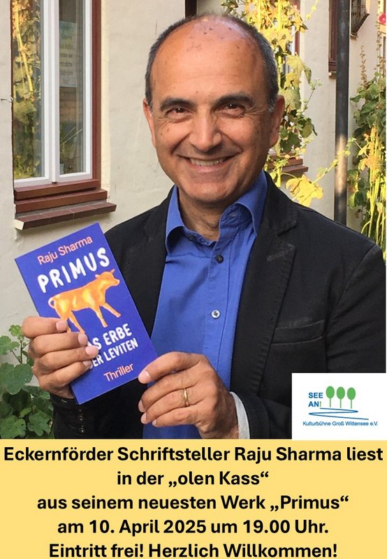 Raju Sharma begann mit dem Schreiben im Jahr 2005. Er verfasst spannungsgeladene Bildungsromane und verbindet dabei Weltgeschichte, Kultur und Religion. 2013 wurde sein Debütroman »INRI – Die Schatulle von Thorsberg« veröffentlicht, ein Historienthriller. Danach folgte „Hineni – Abrahams Messer“ und 2022 erschien "Primus – Das Erbe der Leviten", das zweite Abenteuer der Hauptfigur Charlotte „Charlie“ Mannheimer. Auszüge aus diesem Roman liest der Autor am Donnerstag, den 10. April um 19:00 h im Dorfgemeinschaftshaus "De ole Kass". Über den Inhalt soll an dieser Stelle noch nicht viel verraten werden. Raju Sharma ist ein intelligenter, weltoffener und kluger Erzähler und auch ohne Kenntnisse des vorherigen Werkes entwickelt das Buch eine wunderbare Spannung.
