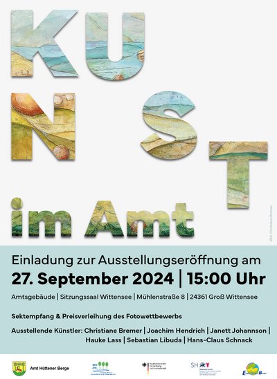 Ab sofort können die von einer Fachjury ausgewählten 12 besten Fotos gemeinsam mit Arbeiten regionaler Kunst von Christiane Bremer, Joachim Hendrich, Janett Johannsen, Hauke Lass, Sebastian Libuda und Hans-Claus Schnack in der nun eröffneten Ausstellung ganzjährig während der Öffnungszeiten im Amtsgebäude Groß Wittensee besichtigt werden. Auf diese Weise werden in Zukunft alle zu Gewinnern, die das Amt aus den unterschiedlichsten Gründen aufsuchen, indem die Schönheit ihrer Heimatregion Hüttener Berge Ihnen immer wieder eindrucksvoll vor Augen geführt wird.