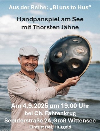 Jähne wird in der Kieler Zeitung folgendermaßen zitiert: "Die Handpan ist neben meiner Frau die zweite große Liebe in meinem Leben. Sie gibt mir sehr viel zurück, und es bringt mir Freude, andere Menschen durch meine Musik zu berühren und ihnen etwas Besonderes geben zu können“. Freuen wir uns also auf etwas ganz Besonderes und lassen die Atmosphäre am See auf uns wirken!!!
