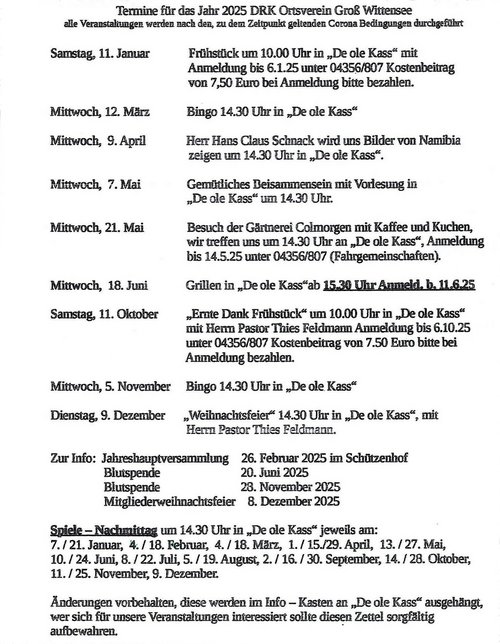 Ganzjährig wird alle zwei Wochen ein Spielenachmittag organisiert, der immer sehr gut besucht ist. Es gibt eine Gruppe, die Rummicup spielt, eine andere Gruppe erfreut sich beim Kniffelig. Andere wiederum finden sich zu einer Skatrunde zusammen. Einmal im Monat gibt es ein gemeinsames Frühstück. In den Sommermonaten werden Radtouren und Ausflüge unternommen.