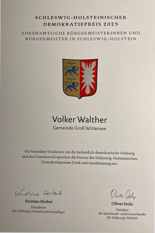In diesem Jahr durfte ich gemeinsam mit anderen Bürgermeisterinnen und Bürgermeistern den Demokratiepreis 2025 des Landes Schleswig-Holstein in Empfang nehmen. Die Urkunde habe ich als Bürgermeister und damit als Stellvertreter unseres Dorfes mit Stolz und Freude in Empfang genommen in dem Bewußtsein, dass diese Auszeichnung nicht einer Person gilt, sondern allen Menschen, die sich für das Wohlergehen unserer Gemeinde einsetzen. Dem Gemeinderat und der gesamten Gemeindeverwaltung möchte ich an dieser Stelle für die vertrauensvolle und stets lösungsorientierte Zusammenarbeit danken. Ihr Engagement ist das Fundament für eine positive Entwicklung unseres Dorfes!