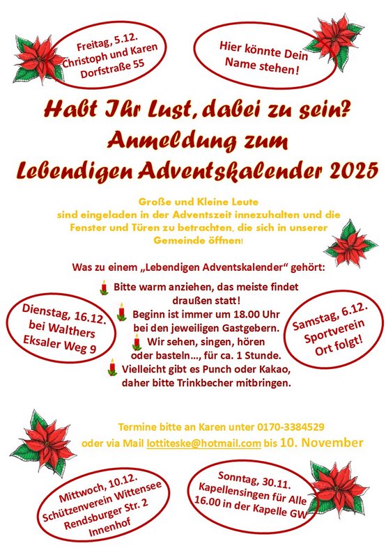 Auch in diesem Jahr wird es in Groß Wittensee wieder einen Lebendigen Adventskalender geben. Wie bei einem "richtigen" Adventskalender öffnen sich dabei die Türen im Dorf und laden ein zu einem vorweihnachtlichen Treffen mit den Nachbarn und Allen, die Lust haben, sich im Plausch mit anderen langsam auf die Weihnachtszeit einzustimmen.